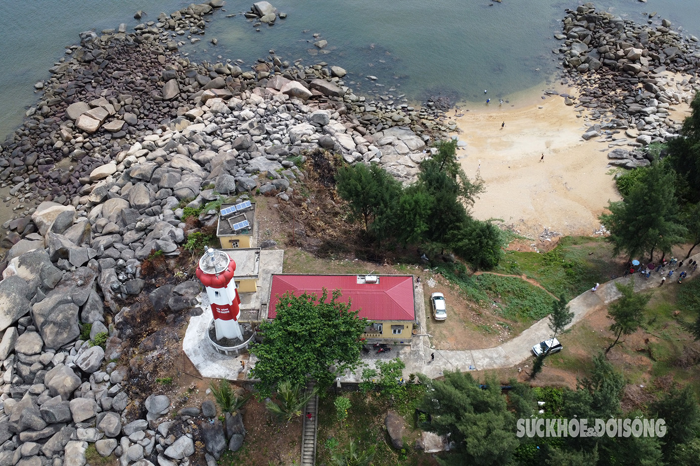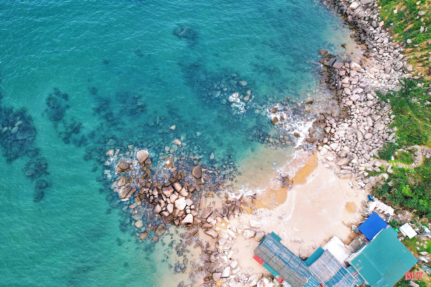 📸 Góc nhìn từ trên cao: Nhìn từ flycam, biển Hải Đăng hiện lên như một bức tranh thủy mặc sống động, nơi sắc xanh của trời hòa làm một với sắc biếc của nước và sắc trầm của đá.