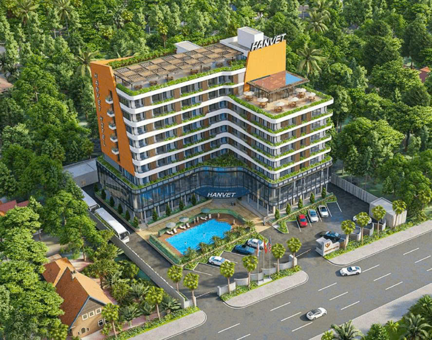 ✨ Ngay từ cái nhìn đầu tiên, Hanvet Hotel gây ấn tượng mạnh với thiết kế hình khối hiện đại. Điểm nhấn nằm ở những mảng tường cam rực rỡ chạy dọc thân tòa nhà, tạo nên một diện mạo trẻ trung và đầy sức sống.