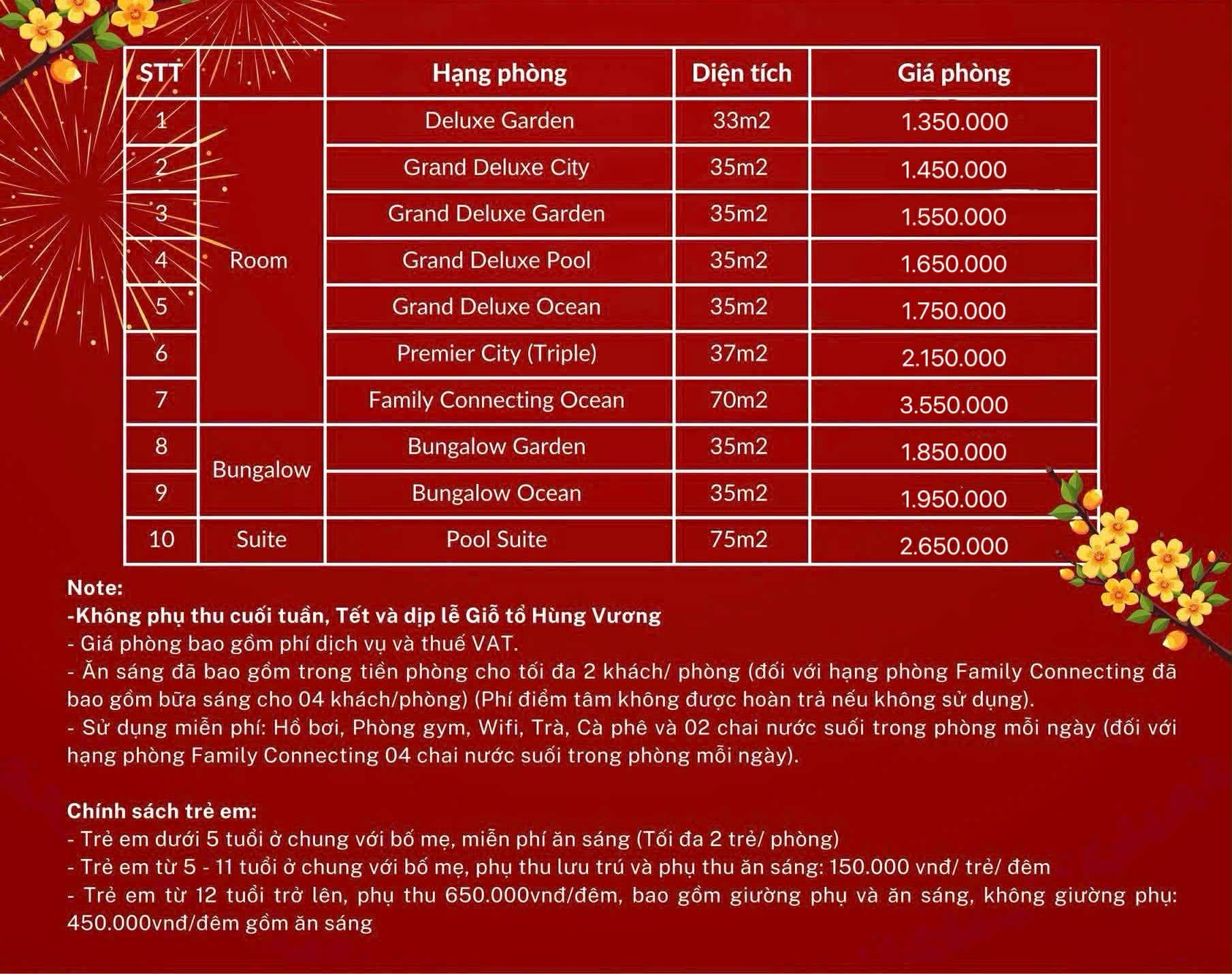 Dưới đây là bảng giá phòng niêm yết và giá ưu đãi đặc biệt khi bạn đặt qua hệ thống của Hello Trip Việt Nam: