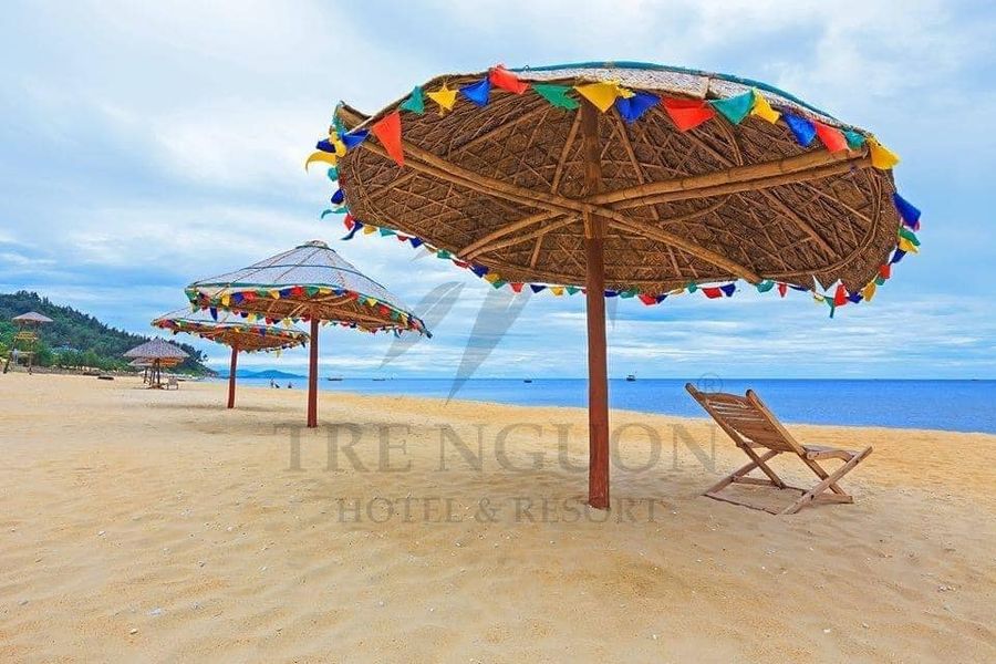 Màu sắc: Nước biển ở đây không chỉ xanh đơn thuần mà biến chuyển theo dải quang phổ: Từ xanh ngọc bích (turquoise) sát bờ đến xanh thẫm (navy) ngoài khơi xa. Bãi cát trắng ngà, mịn màng như lụa, phản chiếu ánh nắng vàng rực rỡ của dải đất miền Trung.